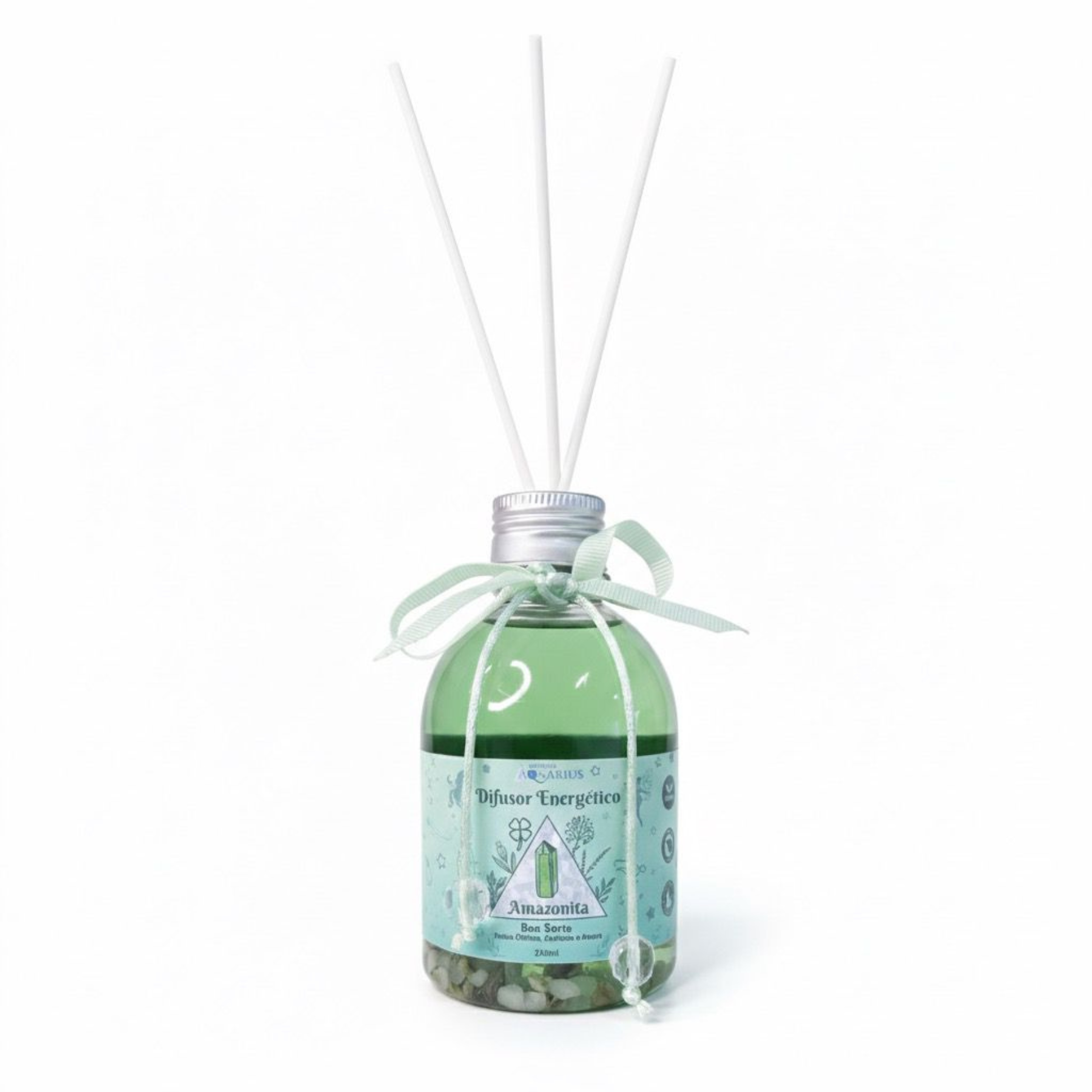 Este é o Difusor Energético de Amazonita da Aquarius Cristais, um produto de 250ml destinado a atrair Boa Sorte e harmonizar o ambiente com energias de fortuna. O cristal Amazonita, reconhecido por suas propriedades de equilibrar o humor e inspirar esperança, está presente na base do líquido, infundindo o difusor com vibrações positivas. Sua fragrância é uma mistura vibrante e estimulante de Frutas Cítricas, Andiroba e Amora. Apresentado em um líquido verde-claro com laço e detalhes na mesma tonalidade, este difusor é ideal para ser usado em espaços onde se busca estimular a tranquilidade, a comunicação clara e a atração de novas oportunidades e sorte.