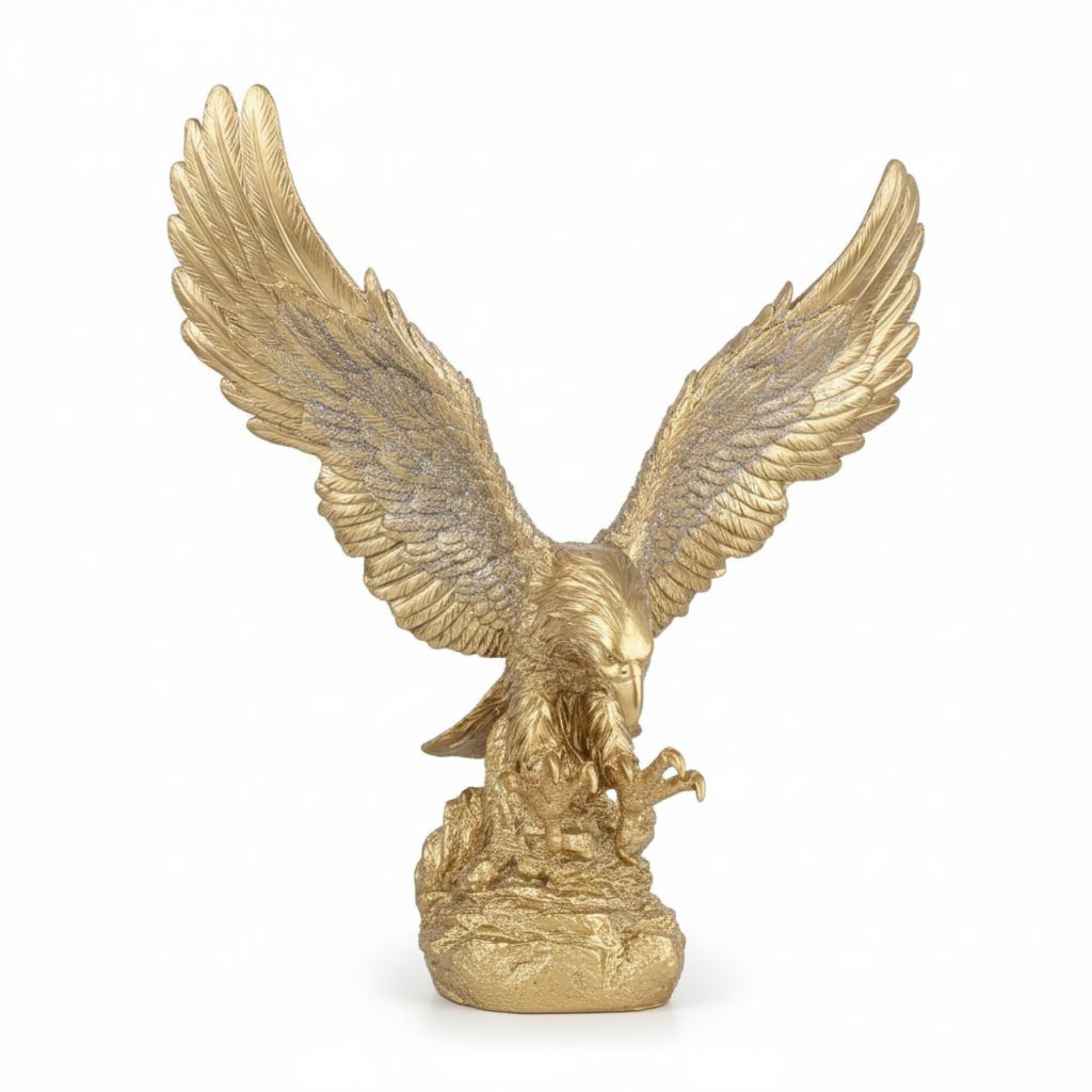 Esta estátua de águia dourada é uma peça decorativa imponente e repleta de simbolismo, representando força, autoridade e visão estratégica. Com um acabamento em tom ouro e detalhes minuciosos nas penas e garras, a escultura captura o momento dinâmico da ave em pleno voo ou em posição de ataque, transmitindo uma sensação de poder e determinação. Ela serve perfeitamente como um item de destaque em escritórios, bibliotecas ou salas de estar, elevando a sofisticação do ambiente e sendo ideal para quem busca uma decoração que inspire liderança e autoconfiança.