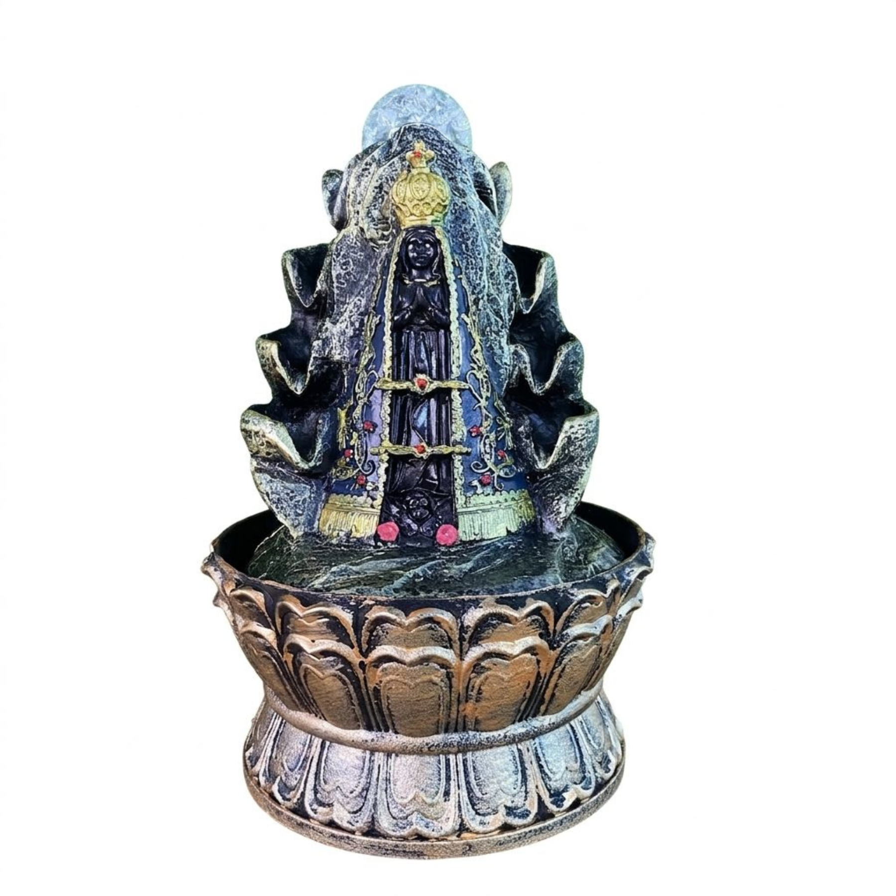 Esta fonte decorativa é uma peça que une espiritualidade e design rústico, apresentando no centro a imagem de Nossa Senhora Aparecida adornada com detalhes em dourado e um manto azul trabalhado. A estrutura, que remete a uma formação rochosa ou gruta com acabamento em tons de cinza e preto, possui pequenas quedas de água laterais que convergem para uma base robusta em formato de taça, decorada com relevos que lembram pétalas de lótus em pátina envelhecida. No topo, uma esfera de vidro transparente completa a composição, sugerindo um ponto de iluminação ou movimento que adiciona um toque de serenidade e elegância ao ambiente.
