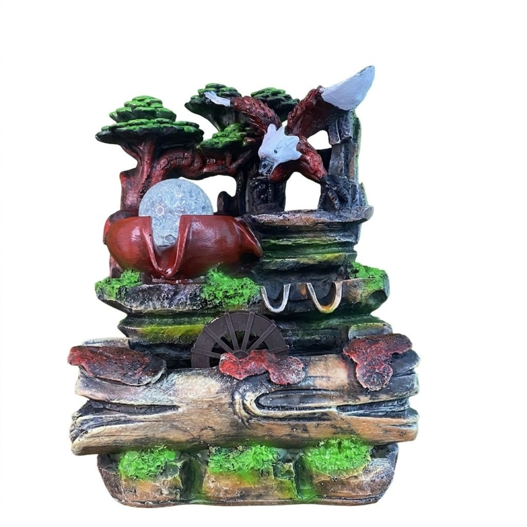 Esta fonte decorativa captura a energia indomada da natureza selvagem, apresentando uma águia com asas abertas que simboliza força, proteção e vigilância. A ave de rapina está pousada no topo de uma estrutura rochosa rústica, coberta por vegetação verdejante e árvores estilizadas que remetem a uma floresta antiga. No centro da composição, uma esfera de vidro cristalino é impulsionada pela água que flui suavemente, simbolizando a clareza mental e a fluidez das emoções. Na base, o tronco de árvore caído e uma roda d'água evocam o movimento perpétuo da vida e o equilíbrio entre a força e a renovação. É um item que não apenas decora, mas atua como um amuleto de coragem e harmonia para o ambiente, convidando à contemplação e à revitalização das energias do espaço.