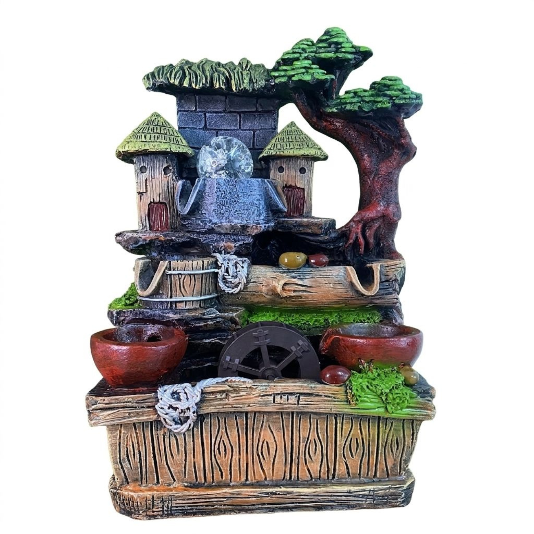 Esta fonte de água decorativa evoca o charme rústico de uma antiga aldeia de contos de fadas, ideal para adicionar serenidade e personalidade a qualquer espaço. O cenário detalhado apresenta charmosas casinhas de campo com telhados de palha e portas vermelhas, aninhadas entre formações rochosas musgosas e a sombra acolhedora de uma árvore de bonsai com folhagem verde vibrante. Centralmente, uma esfera de cristal giratória brilha, impulsionada pelo fluxo de água que serpenteia por calhas de madeira e cai em taças de terracota vermelhas, movendo uma roda d'água funcional na base. Elementos como pedras coloridas e texturas de madeira realista completam esta peça única, que combina a beleza da natureza com o som relaxante da água para criar uma atmosfera de paz e bem-estar.