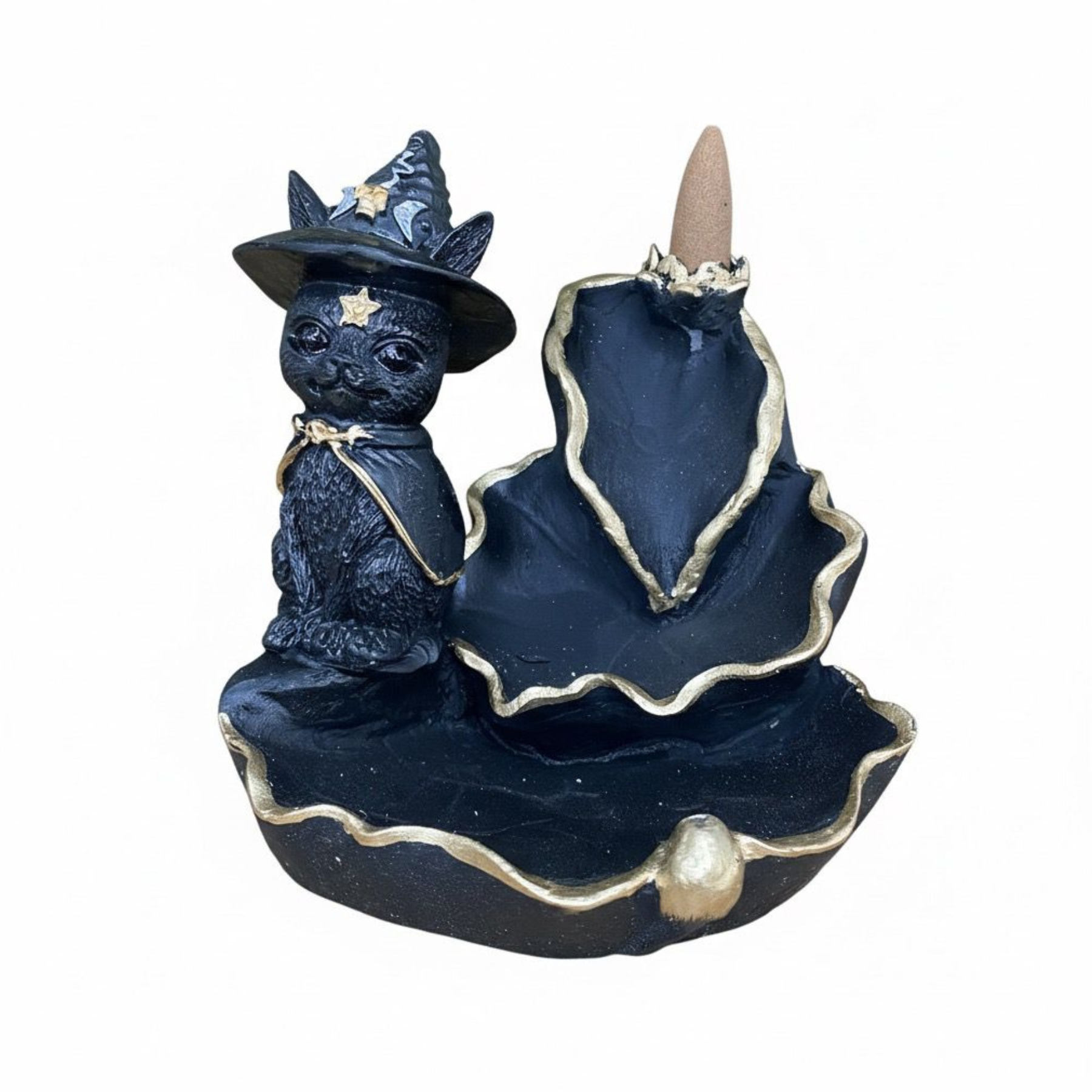 O Incensário Cascata Gato é projetado para criar um efeito visual impressionante. Quando o incenso em cone é aceso, a fumaça desce suavemente, criando uma cascata mágica. Esta peça é perfeita para quem aprecia a estética esotérica e deseja adicionar um toque de magia ao seu espaço.