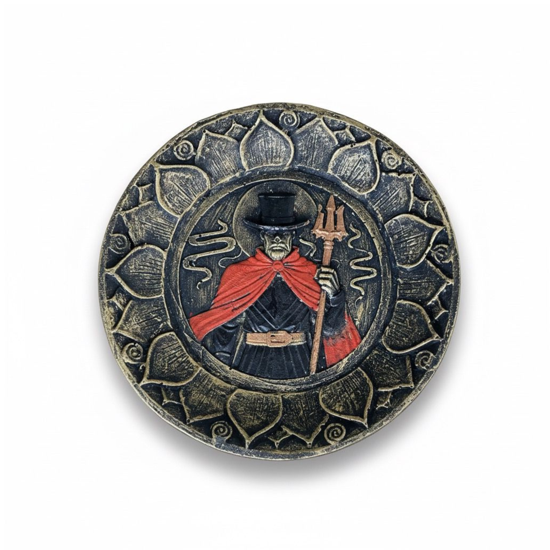 Este incensário em formato de pratinho homenageia Exu, o orixá e entidade guardiã dos caminhos, da comunicação, da ordem e do movimento. A figura central de Exu é representada com um aspecto imponente e misterioso. Ele veste uma capa de cor vermelha e preta, cores que simbolizam o dinamismo, a transformação e a vitalidade, e usa uma cartola, reforçando sua natureza astuta e sua ligação com a rua e o mundo material. Em sua mão, ele segura um tridente (ognã), seu instrumento simbólico, que representa seu domínio sobre a encruzilhada e a capacidade de direcionar as forças da natureza e os caminhos da vida. O medalhão é cercado por uma borda em alto-relevo de pétalas de lótus, com um acabamento em pátina escura e dourada/bronze envelhecido, conferindo à peça um ar de mistério e poder. É um item ideal para rituais de firmeza, proteção, e para pedir a Exu que abra os caminhos e transmita mensagens com clareza.