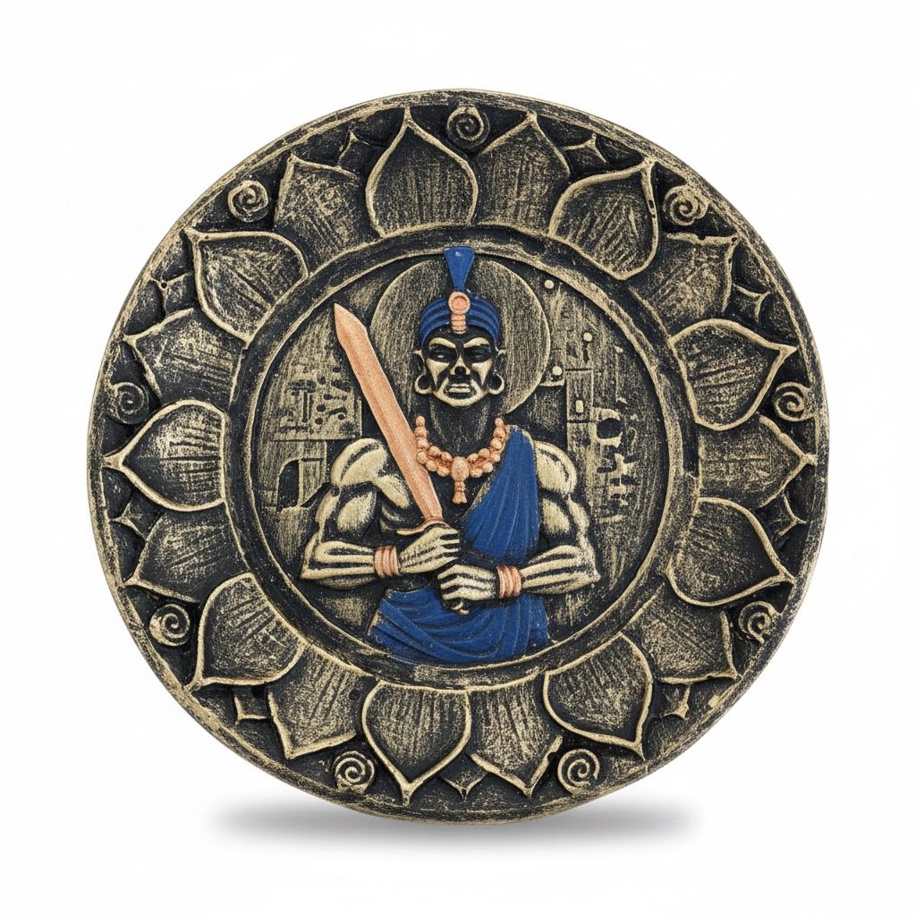 Este incensário em formato de pratinho é uma reverência a Ogum, o orixá do ferro, da guerra, da tecnologia e dos caminhos abertos. A figura central representa Ogum como um guerreiro destemido e resoluto, com uma postura de força e vigilância. Ele está vestido em cores que remetem à sua natureza, como o azul-marinho ou o azul-escuro, e ostenta colares de contas nas cores azul e vermelho/bronze. O orixá empunha uma espada (ou alfange), símbolo de sua habilidade em forjar ferramentas, vencer batalhas e abrir novos rumos. Sua expressão é concentrada e poderosa, evocando sua autoridade e determinação. O medalhão é emoldurado por uma borda em alto-relevo de pétalas de lótus, com um acabamento em pátina escura e dourada/bronze envelhecido, conferindo à peça um aspecto sóbrio e forte, ideal para rituais de proteção, para pedir firmeza e coragem, e para invocar a força de Ogum para superar obstáculos.