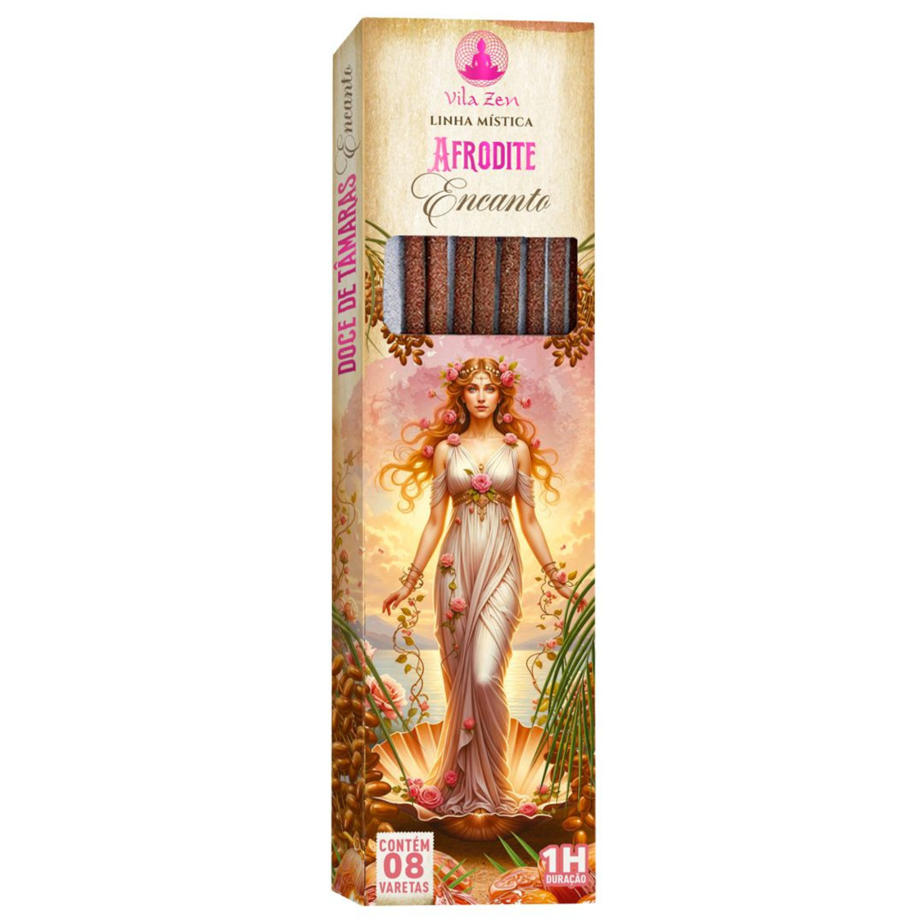 O incenso Afrodite Encanto da linha mística Vila Zen apresenta um aroma doce e envolvente, com notas suaves e sedutoras inspiradas na delicadeza das flores e na cremosidade da doce de tâmaras. Sua fragrância cria uma atmosfera acolhedora e harmoniosa, ideal para estimular o amor-próprio, a autoestima e a conexão com a energia do afeto e da sensualidade. Ao ser aceso, ajuda a relaxar a mente, aliviar tensões e despertar sentimentos positivos, sendo perfeito para momentos de autocuidado, romantismo ou simplesmente para tornar o ambiente mais leve e encantador.