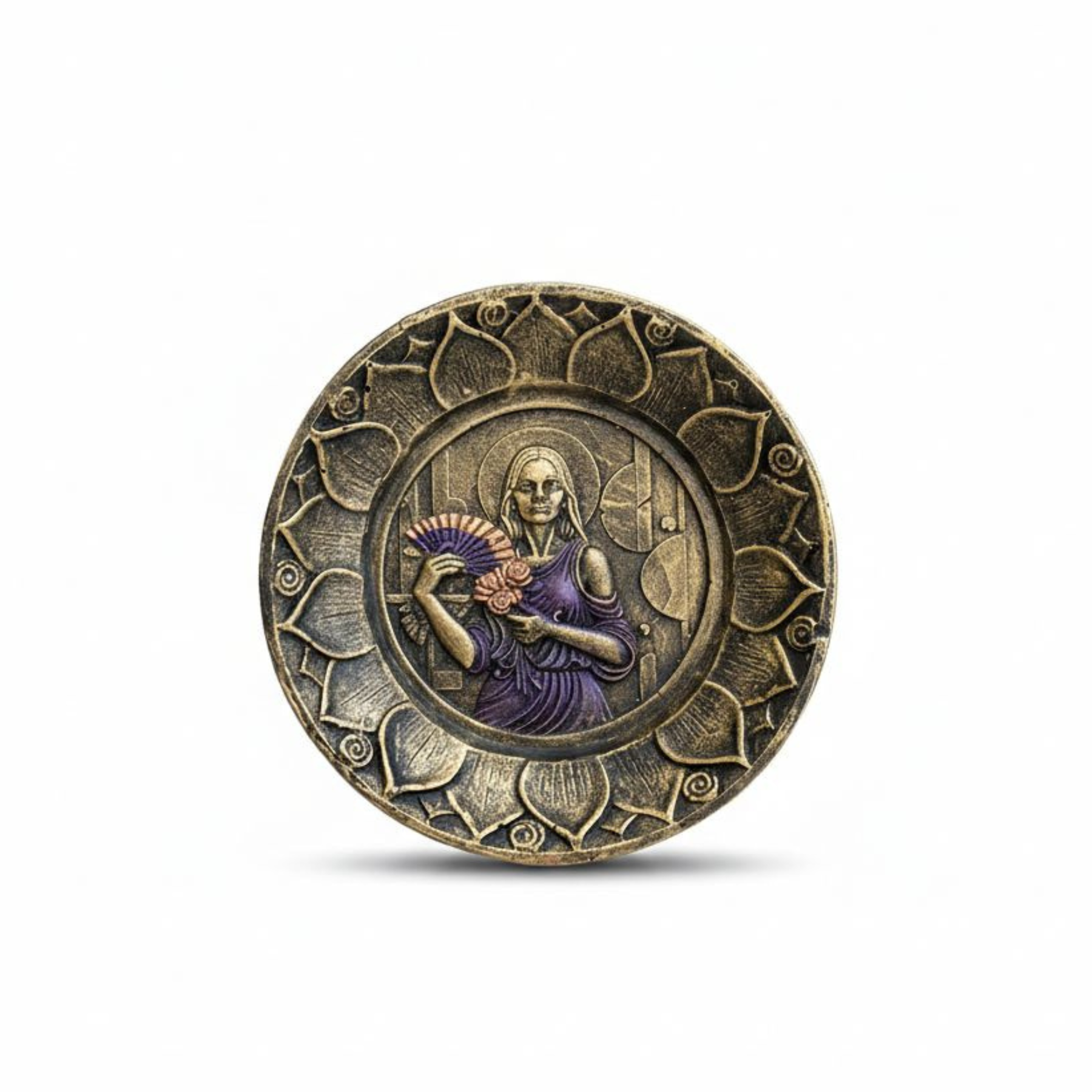 Este incensário apresenta um design circular em relevo, destacando ao centro a figura da Pompa Gira Maria Mulambo, representada com seu característico leque e vestimentas em tons de roxo e dourado. A peça é emoldurada por pétalas de lótus que conferem um aspecto sagrado e ornamental, utilizando um acabamento em pátina envelhecida que reforça sua estética mística e artesanal. É um item ideal para práticas espirituais e rituais de purificação, servindo tanto como um suporte funcional para queimar incensos quanto como um objeto de devoção e decoração que simboliza a força e a elegância dessa entidade.