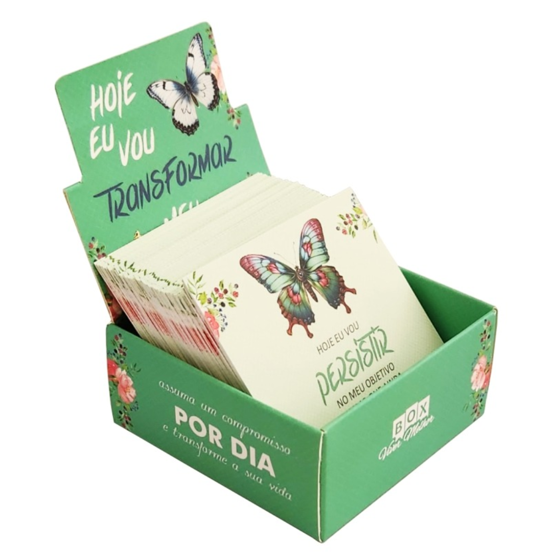 Caixinha contendo 100 cartões com propósitos de ação para serem adicionados à sua rotina, gerando uma transformação positiva...