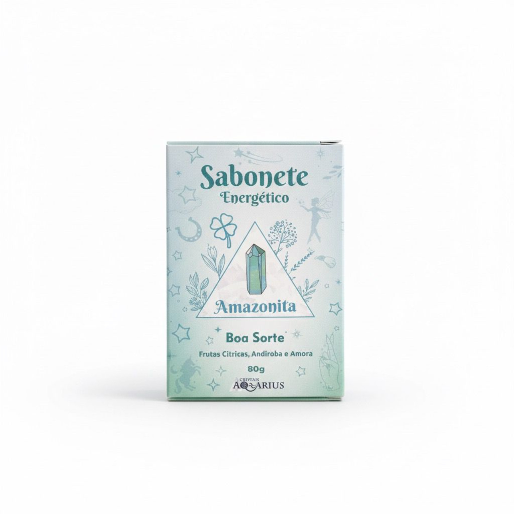 Este é outro produto da linha Sabonete Energético da Aquarius Cristais, desta vez focado em atrair Boa Sorte através da energia da Amazonita. A Amazonita, conhecida por suas propriedades calmantes e de equilíbrio, é associada à sorte e à manifestação de desejos positivos. O sabonete, que também pesa 80g, apresenta uma fragrância cuidadosamente elaborada com notas de Frutas Cítricas, Andiroba e Amora. Sua embalagem possui um tom verde-claro suave, decorada com elementos místicos como ferraduras, fadas e trevos de quatro folhas, refletindo a intenção de harmonizar o corpo e o espírito para receber a fortuna.